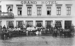 Grand Hotel, girlander, flagg, mennesker... Fotograf L. Szacinski – 1908