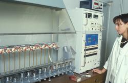 Laboratorium med røykemaskin som måler i... Fotograf Ukjent –