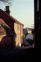 gateløp, trehusbebyggelse, kvinne Fotograf Ørsted, Henrik – 1965