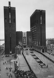 Stortorvet 7 og 8 pyntes til kongens hje... Fotograf Helland, Odd – 1945