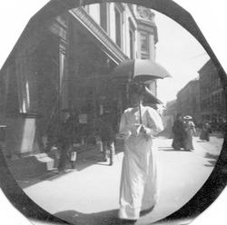 Kvinne med parasoll i bygate, ant. Oslo.... Fotograf Størmer, Fredrik Carl Mülertz – 1893 – 1897