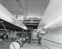 bilverksted, interiør, smøregrav, mann, ... Fotograf Ørnelund, Leif Krohn – 1959