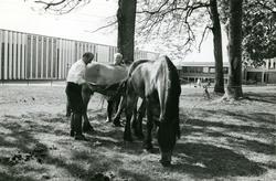 Hester bundet fast i trær utenfor fabrik... – 1978