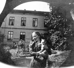 Frk. Anna Holm foran hus med åpent vindu... Fotograf Størmer, Fredrik Carl Mülertz – 1893 – 1897