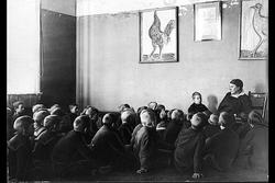 Fra håndarbeidstimen. Håndarbeidlærerinn... Fotograf Ukjent –