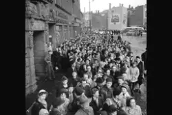 Fra Jernbanetorget. Publikum venter på j... Fotograf Ukjent – 1950